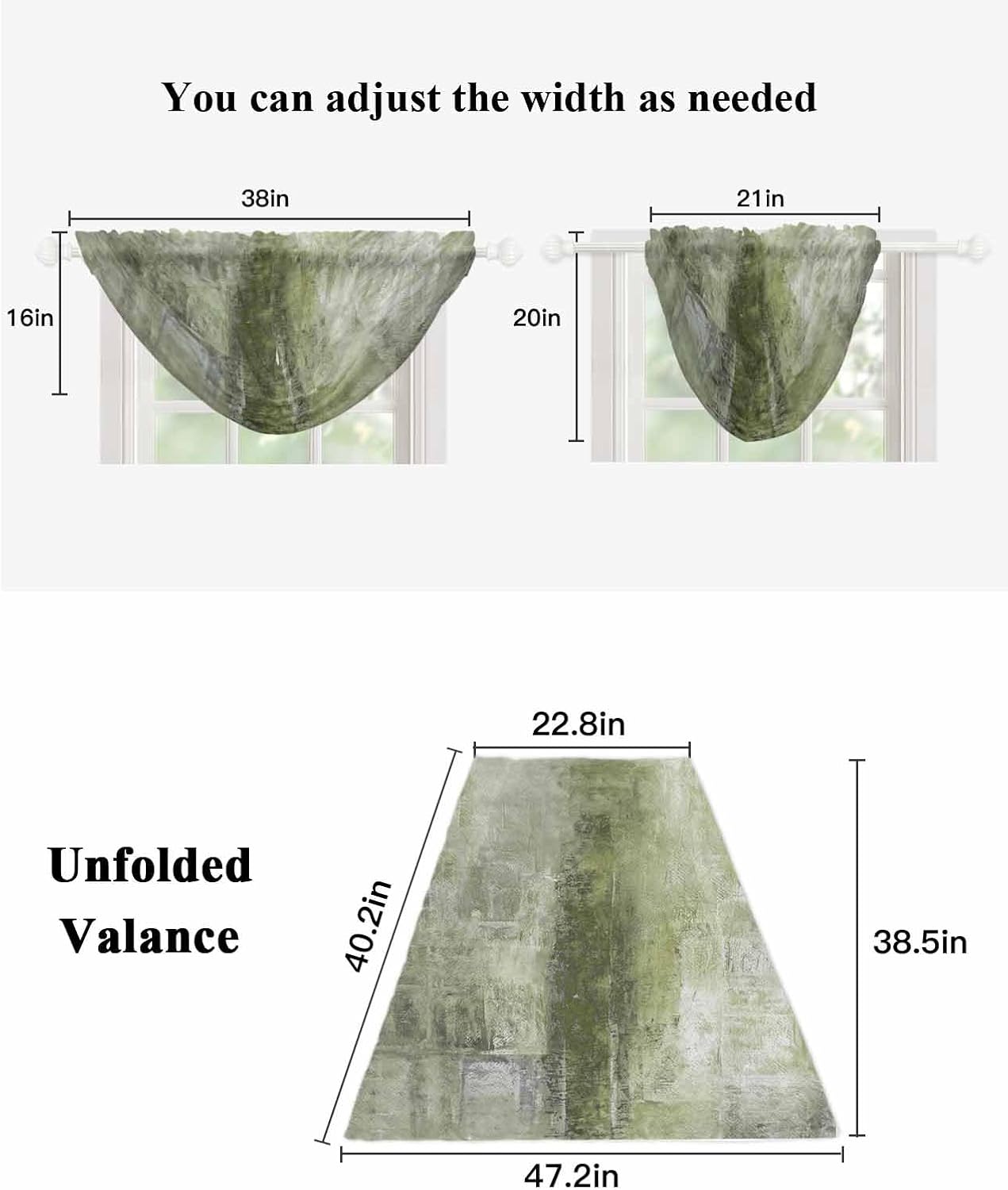 If you are looking for a window treatment that would add a little presence and pop of color, Hokiten Rustic Sage Green Sheer Waterfall Valance Curtain would be a good choice.Good Performance- Crafted with meticulous attention to detail, our waterfall valances boast a unique design that cascades gracefully down your windows, resembling the gentle flow of a soothing waterfall.- Chiffon curtains can help filter glare and soften sunlight, balance the sunlight levels indoors and outdoors, while making the room more breathable.- Sheer swag valance also makes an ideal gifting option to your loved ones. Deeply impressed your friends, family, and guests with these window curtain panels on any window.- One of the standout features of our kitchen waterfall valances is their easy-care nature. The high-quality materials ensure these valances maintain their shape and form over time, allowing you to enjoy their beauty for years to come. no hassle or extra effort required!- Sheer window toppers valances perfectly enhances the atmosphere of various holidays and events, such as Christmas, Easter, Thanksgiving, weddings, birthdays, parties, housewarmings and more.Package DetailsPacking list: The sheer waterfall valance curtain measures 38.5 x 47.2 inches(98 x 120 cm) with 3 inches rod pocket on top.Quantity selections: There are three quantities to choose from, 1/2/3 in pack. The superposition of multiple tie-in effect more beautiful than single panel style, it is recommended to use 2 or more Valance.Warm Notice1. Machine washable, please do not use bleach.2. Manual measurement, please allow slight size differences.3. Due to different screen displays, the colors may be slightly different.4. The product may be slightly wrinkled during shipping, simple ironing after receiving the item, winkles will disappear after hanging for a few days.