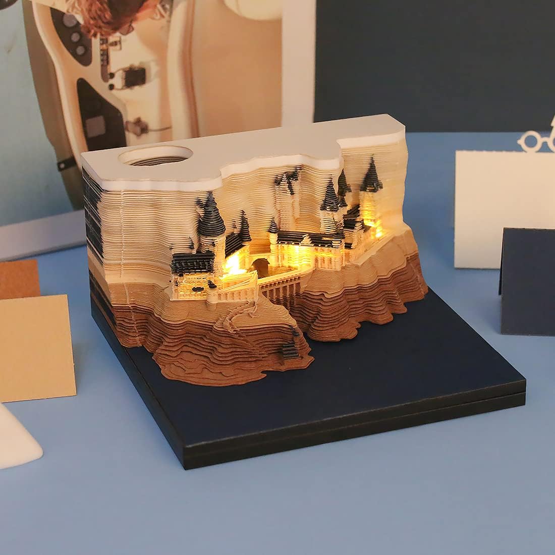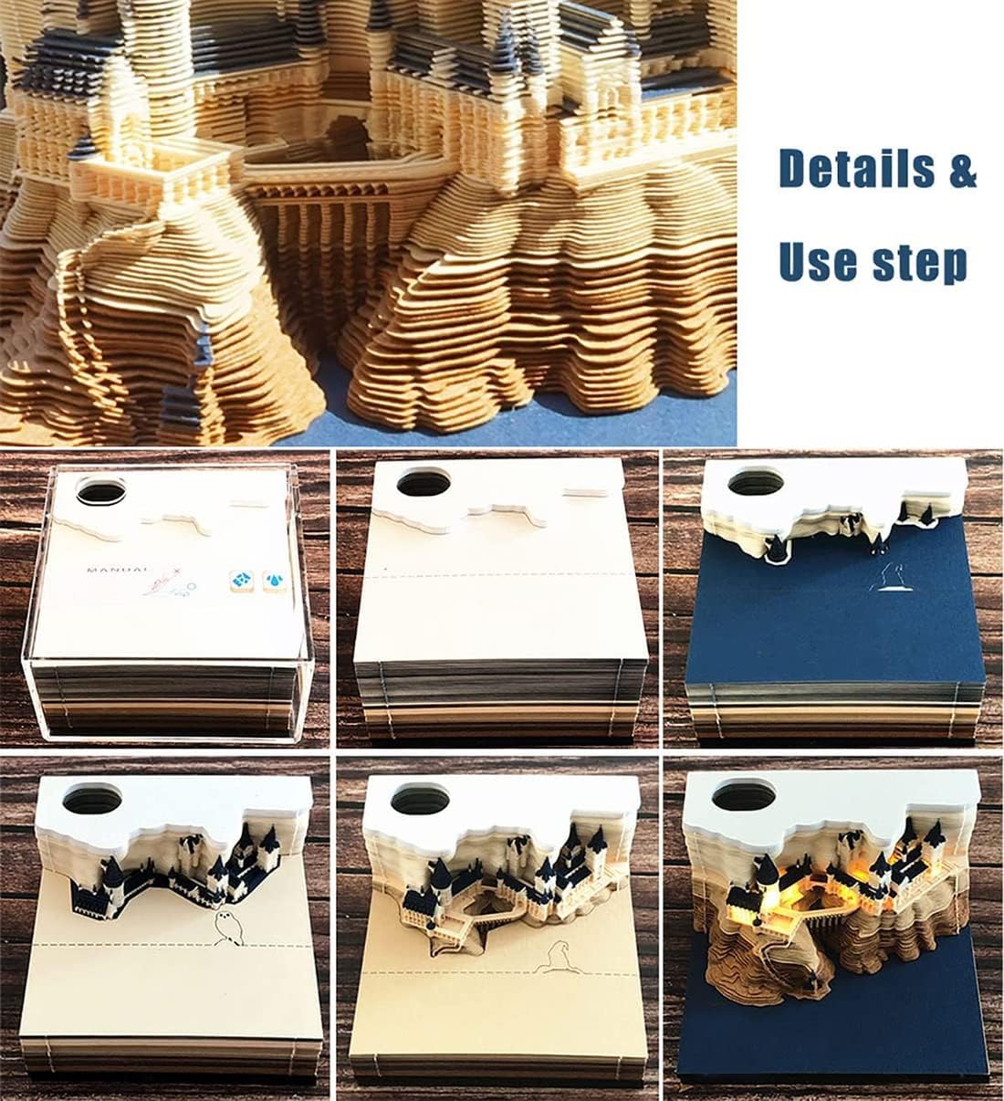 Magic Castle 3D memo pad with Pen HolderSpecificationsName: 3D Paper art memo padMaterial: Environmentally-friendly paperSize: 3.54x3.54x1.89 inches Argyle Box 3.85x3.85x2.15inPackaging gift box 4.25x4.06x2.44inPage: 170 sheets Weight:380gPacking list3D Memo Pads * 1Transparent Acrylic Box * 1 (Display and protect it from dust and humidity )Exquisite Packaging Box * 12 CR2032 BatteriesFunctionRemind urgent matters; Special decoration for any occasion; Colorful different elements paper sticker catch attention; Unique gift for anyone; Make work efficient; Relieve stress and anxiety; Can be used as a non-sticky note, pen holder and bookmarks.How to useOne time tear off one sheet and enjoy the process in which pleasantly surprises are discovered.You can choose 3d paper art notepad as a gift for your kids, friends,classmate ,colleagues on anniversary, birthday, christmas, valentine's day, mother's day.Plus: If you have any questions, please feel free to contact us, we will solve it for you within 24 hours!