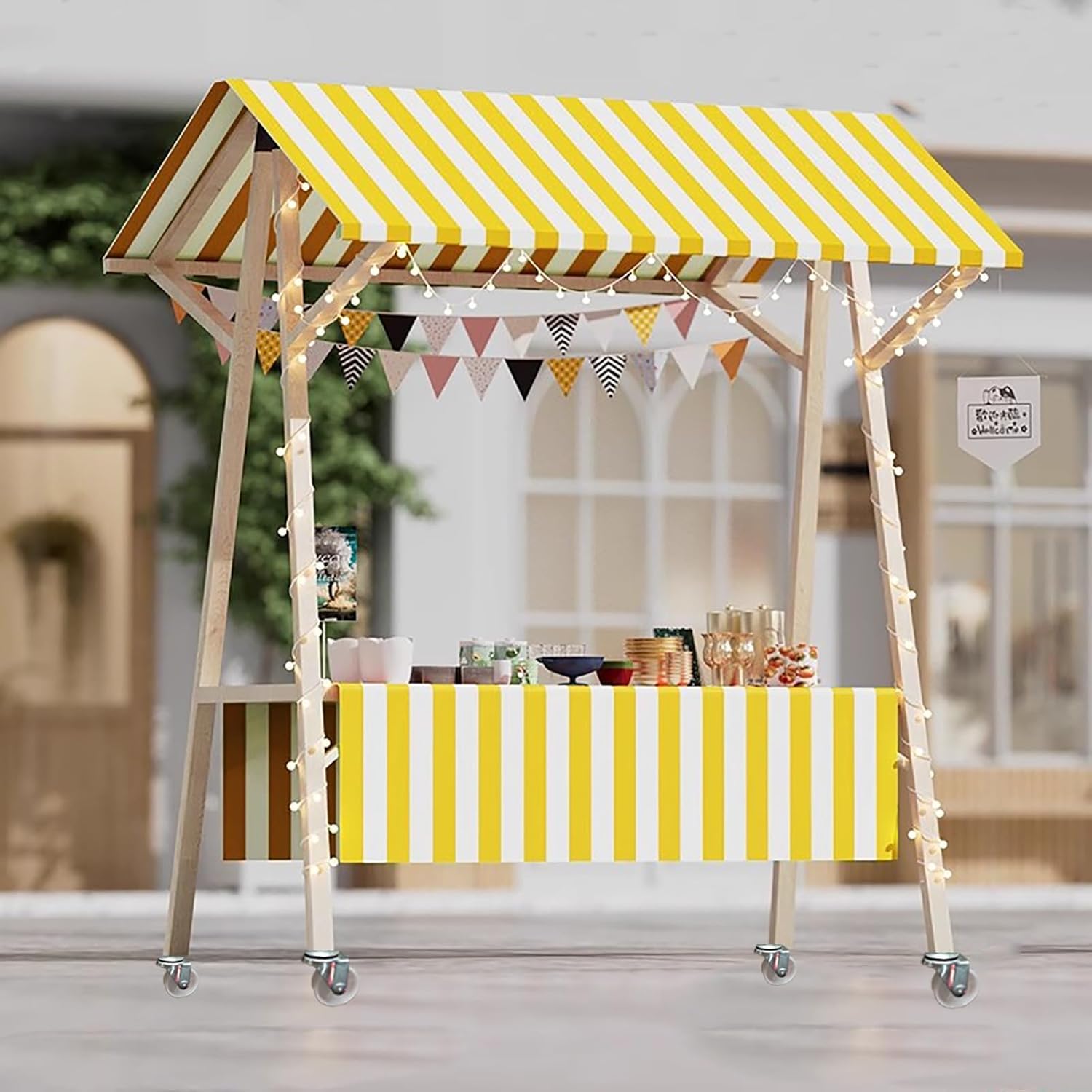 Are you ready to elevate your mobile vending experience? Our versatile street food cart with wheels is designed for easy mobility, allowing you to effortlessly transition between bustling city centers, vibrant beaches, and popular high streets. Setting up your stall has never been easier. With a foldable design, this cart can be unfolded in just 30 seconds, giving you the advantage to secure prime locations quickly. **Package Includes:** - 1 x Vendor Cart (Decorations not included) - Screw Mounting Accessories - 4 Wheels - Canopies - Tablecloths **Key Advantages:** - Quick 30-second setup - Installation takes only 3 minutes **Specifications:** - Material: Wooden - Canopy Material: Oxford Cloth - Load Capacity: 200kg (440lbs) - Width Options: 120cm (47.2") / 150cm (59") - Height: 190cm (74.8") - Color Options: Red, Yellow, Blue, Green, Pink, Orange (multiple shades available) **Features:** - Equipped with wheels for effortless movement - Durable wooden frame for excellent load-bearing capacity - Triangular structure ensures stability - Protective canopy shields against wind and rain - Elegant silk tablecloth enhances the atmosphere - Compact design for easy storage in a car trunk, behind a door, or in a garage - Ideal for use at beaches, trade shows, market stalls, and various events **Important Notes:** - Exercise caution during installation to avoid scratches from the wooden components. - Recommended to use wheels on smooth surfaces to minimize wear. - Manual measurements may vary slightly by 1-2 cm; please refer to the actual product. - Color variations may occur due to lighting during photography and different screen displays; please rely on the product received. Transform your mobile food business with our street food cart, designed for convenience and practicality in every selling scenario.