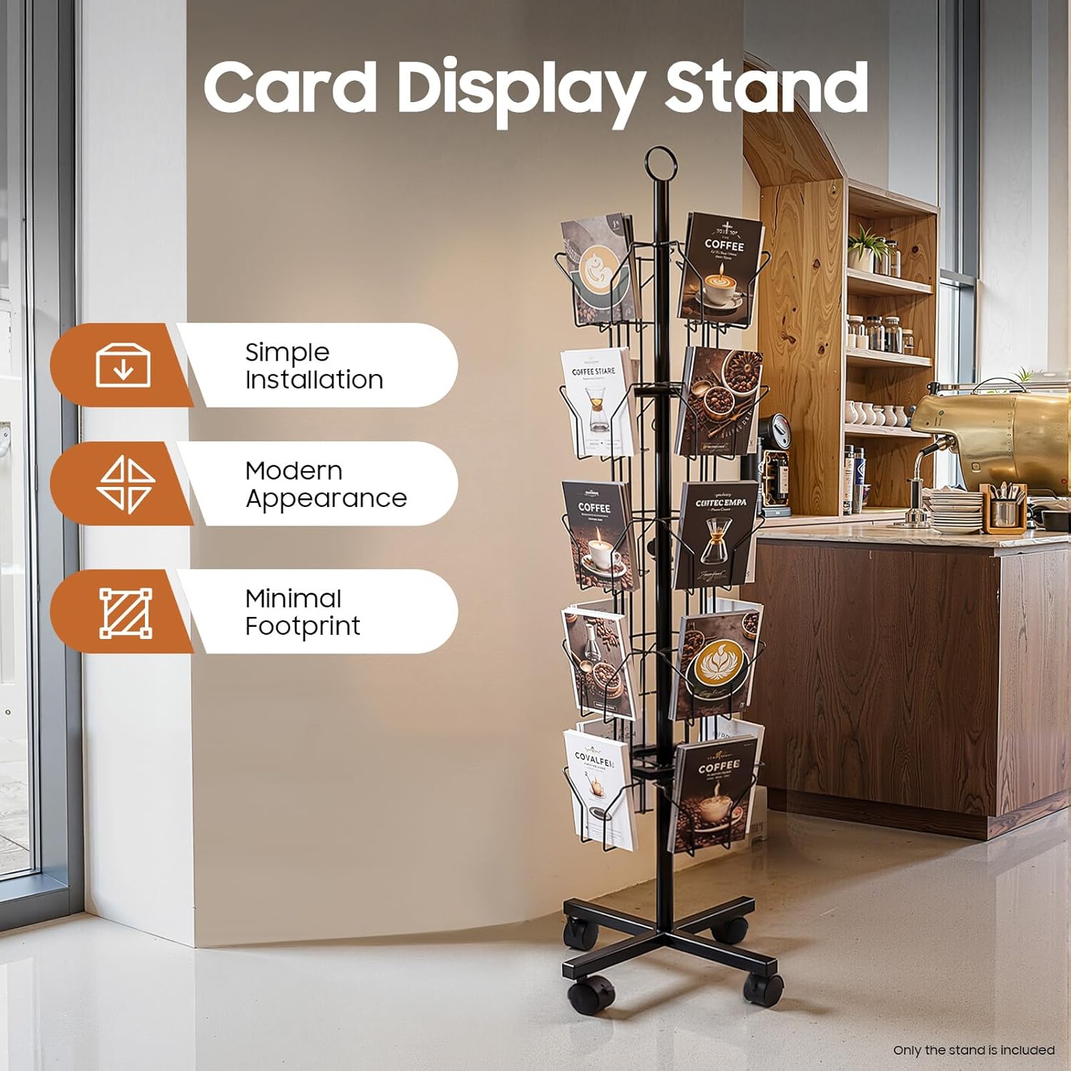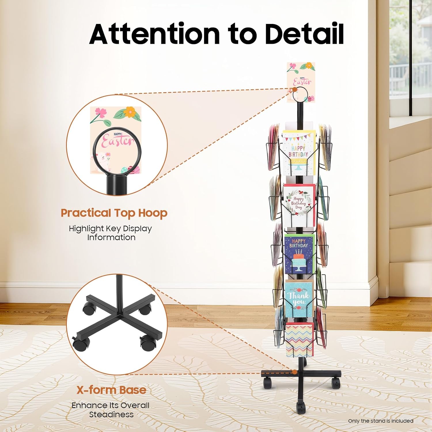 DescriptionThe combination of high-quality material and exquisite craftsmanship makes this card display stand sturdy and durable. The 20 card pockets and a 360 ° rotatable design enable you to store and showcase your cards conveniently. Its simple structure and smooth surface allow for easy cleaning and installation. In short, it is an ideal solution for storing and displaying your stickers, brochures, postcards, etc.Details1. X-shaped Base: It makes the product more stable and prevents wobbling.2. Top Hoop: It provides extra conspicuous space for you to display themes, price lists, discounts, prices, or other information.ApplicationIt is suitable for classrooms, offices, libraries, shopping malls, supermarkets, craft shows, gift shops, etc., and is used to store and display stickers, brochures, postcards, gift cards, CDs, etc.SpecificationsColor: Black/WhiteStyle: ModernMaterial: Cold-rolled Steel Process: Spray PaintingMount Type: Free StandingAssembly Required: YesWheel Type: 4 Universal Wheels (2 with Locks)Number of Display Frames: 20 Number of Tiers: 5Rotation Angle: 360°Overall Product Height: 1.52m/4.99ftEach Cross Bar Length: 40cm/15.75inStorable Maximum Card Size: 21*15cm/8.26*5.9inGross Weight: 3.2kg/7.05 lbsNet Weight: 2.8kg/6.17 lbsPackage Size: 89*36*10.1cm/35.03*14.17*3.97inPackage Included1* Card Display Stand4* Universal Wheels1* English Installation Diagram Other Accessories for InstallationNotes1.Please note that our product does not include any cards.2.Please check the size carefully before ordering.3.Please install it according to the diagram.